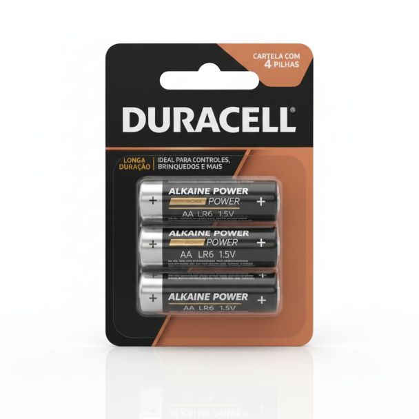 Cartela com 4 pilhas alcalinas tamanho AA. Ideal para mouses e teclados sem fio.
